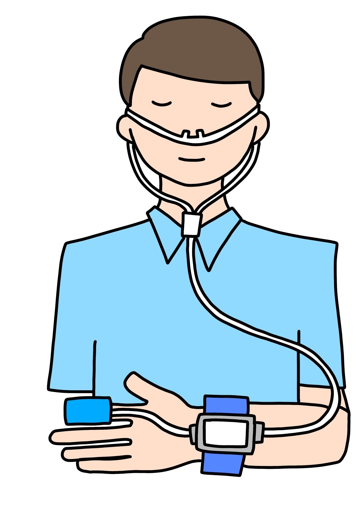 手の指や鼻の下にセンサーをつけ、いびきや呼吸の状態から睡眠時無呼吸症候群(SAS)の可能性を調べます。自宅でもできる検査なので、普段と変わらず仕事や日常生活をそれほど心配せずに検査することができます。